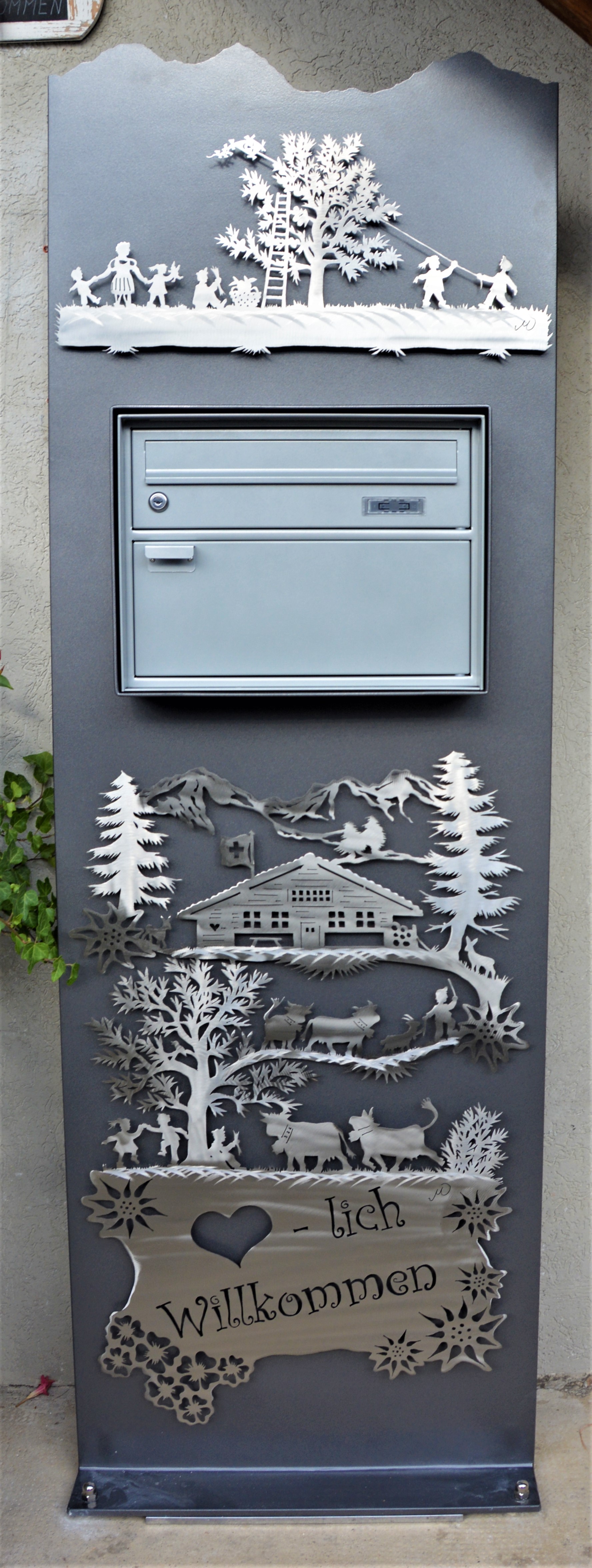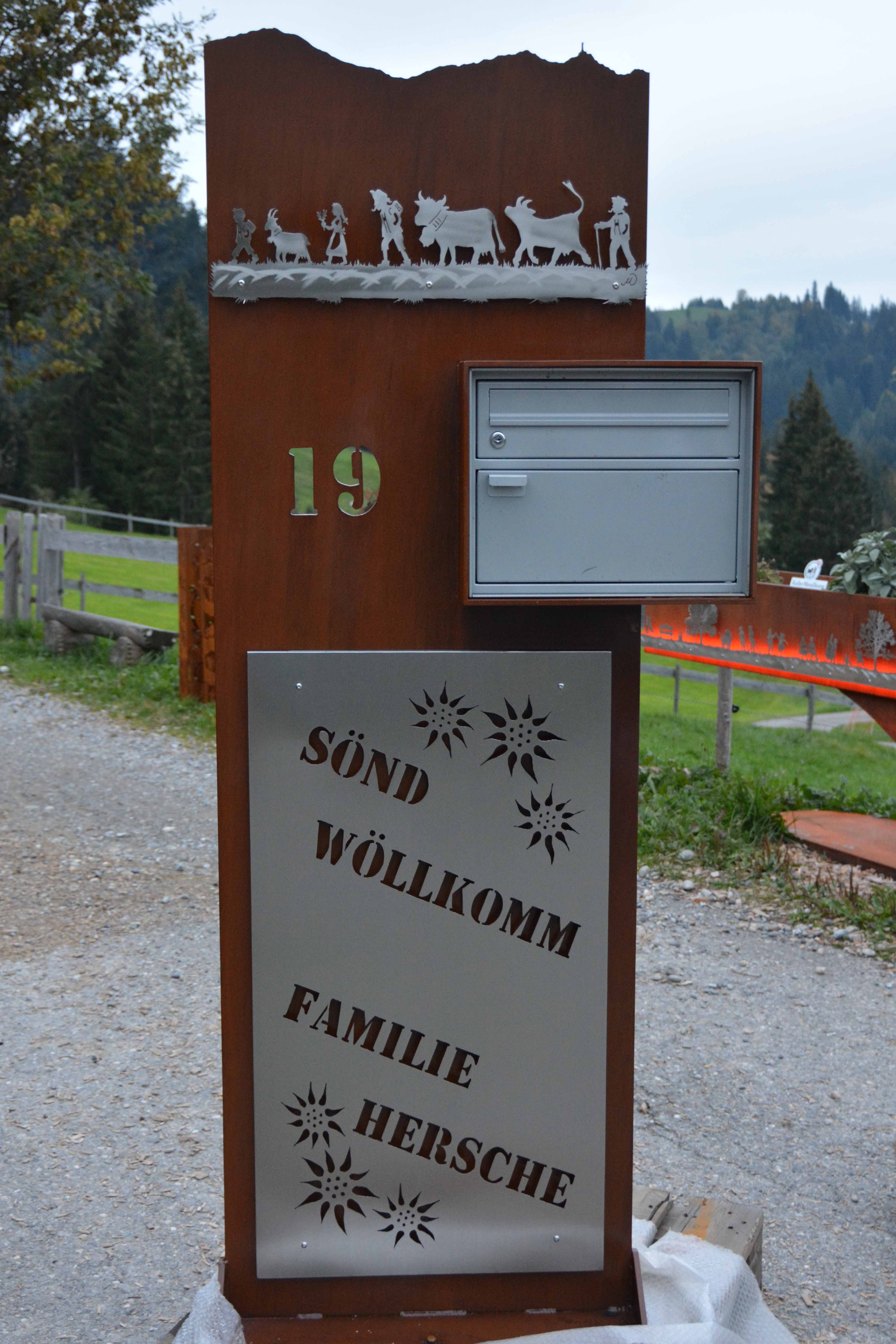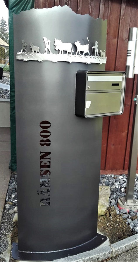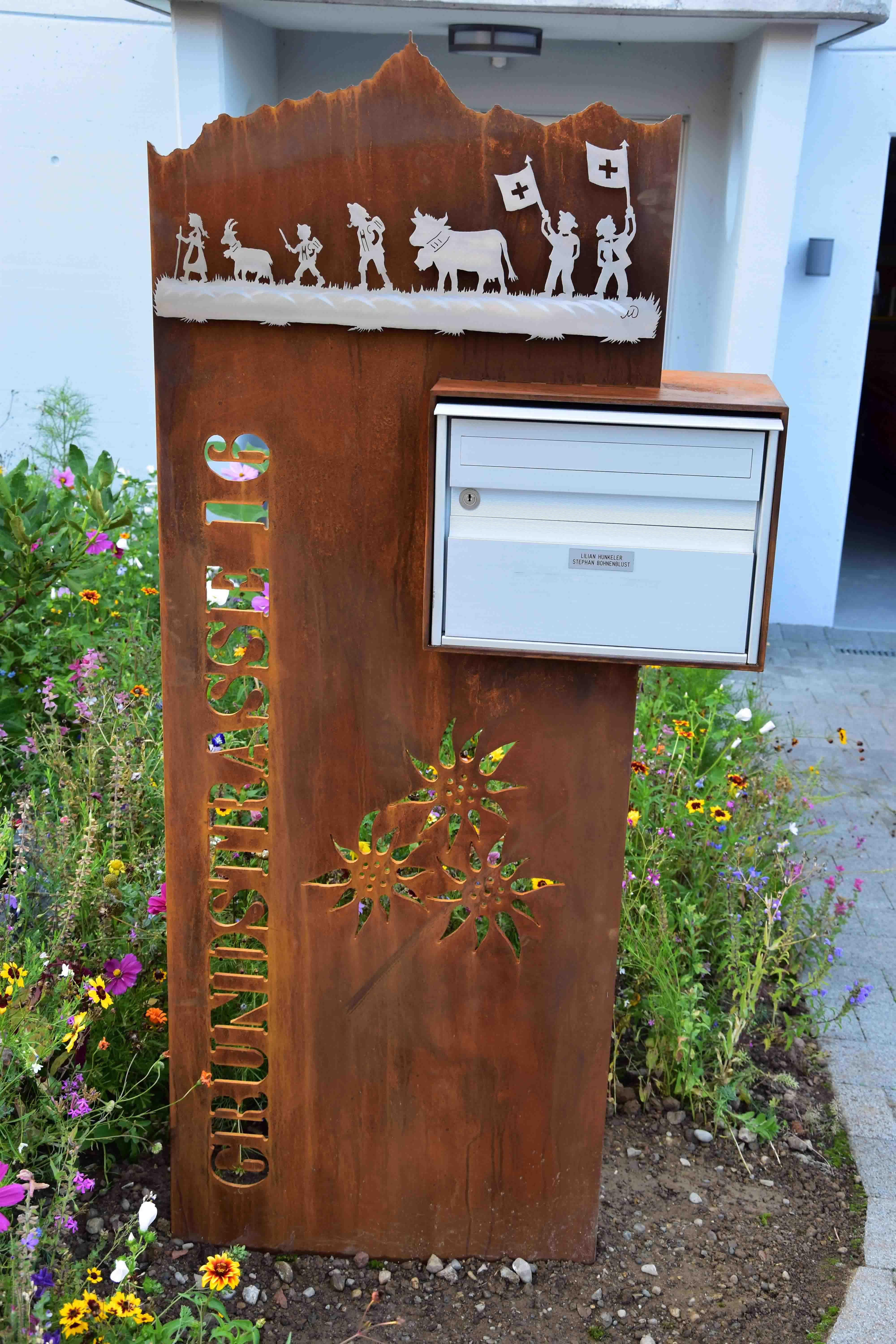 Briefkasten Spezial aus 8mm Stahl mit Bergsicht und Sujet aus Edelstahl lackiert, mit integriertem Briefkasten. Strassenname seitlicht ausgebrannt.