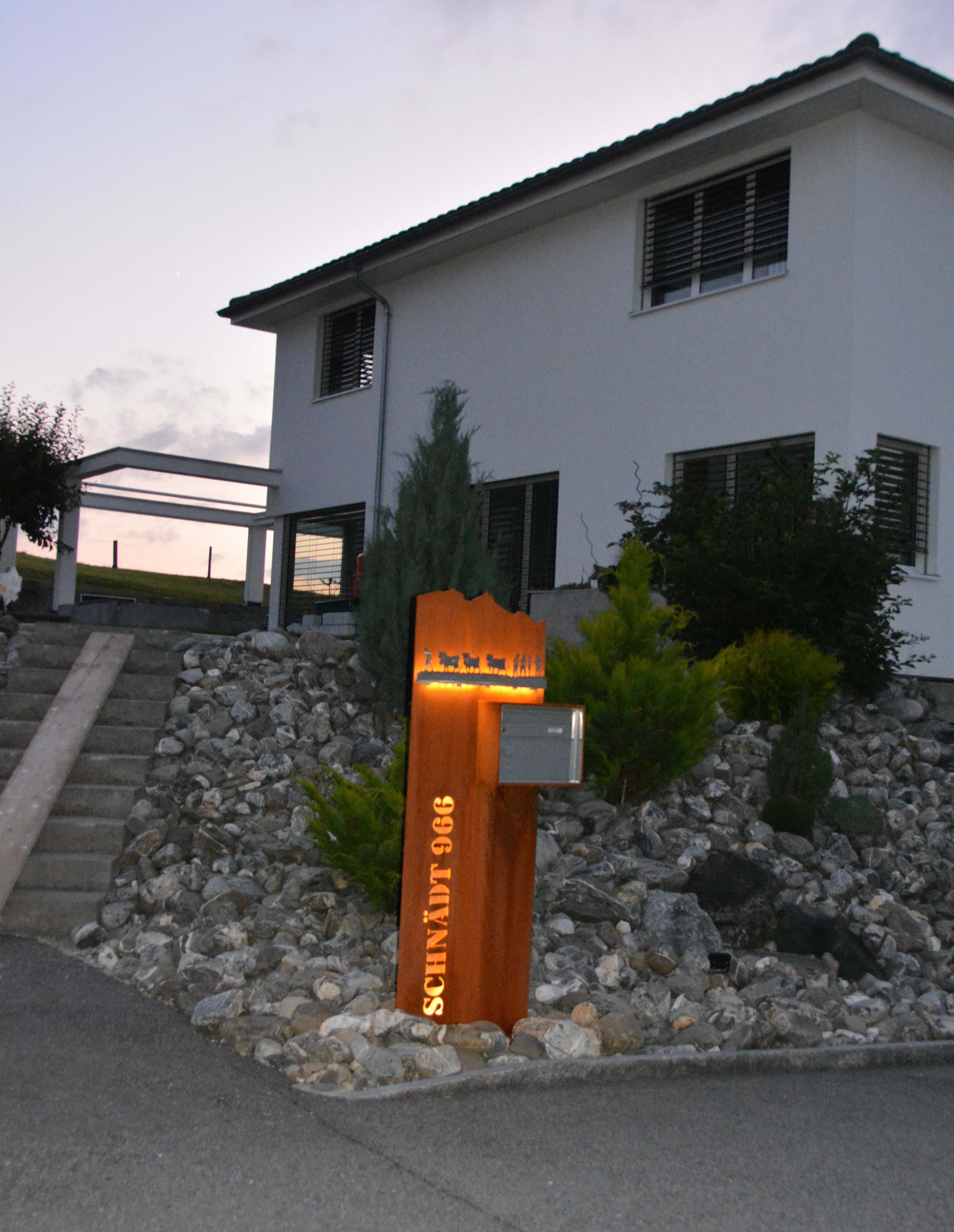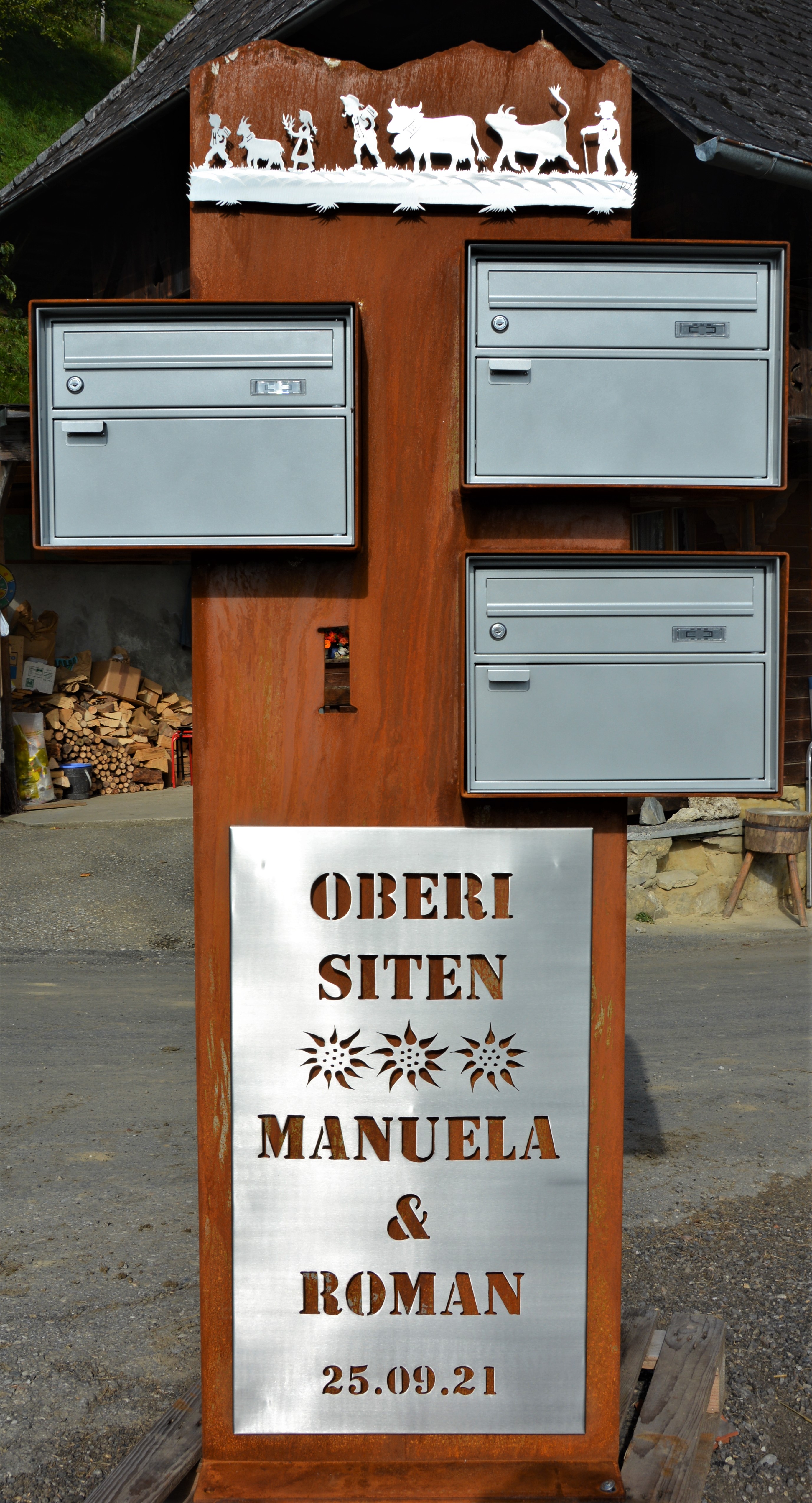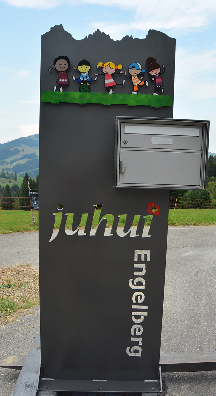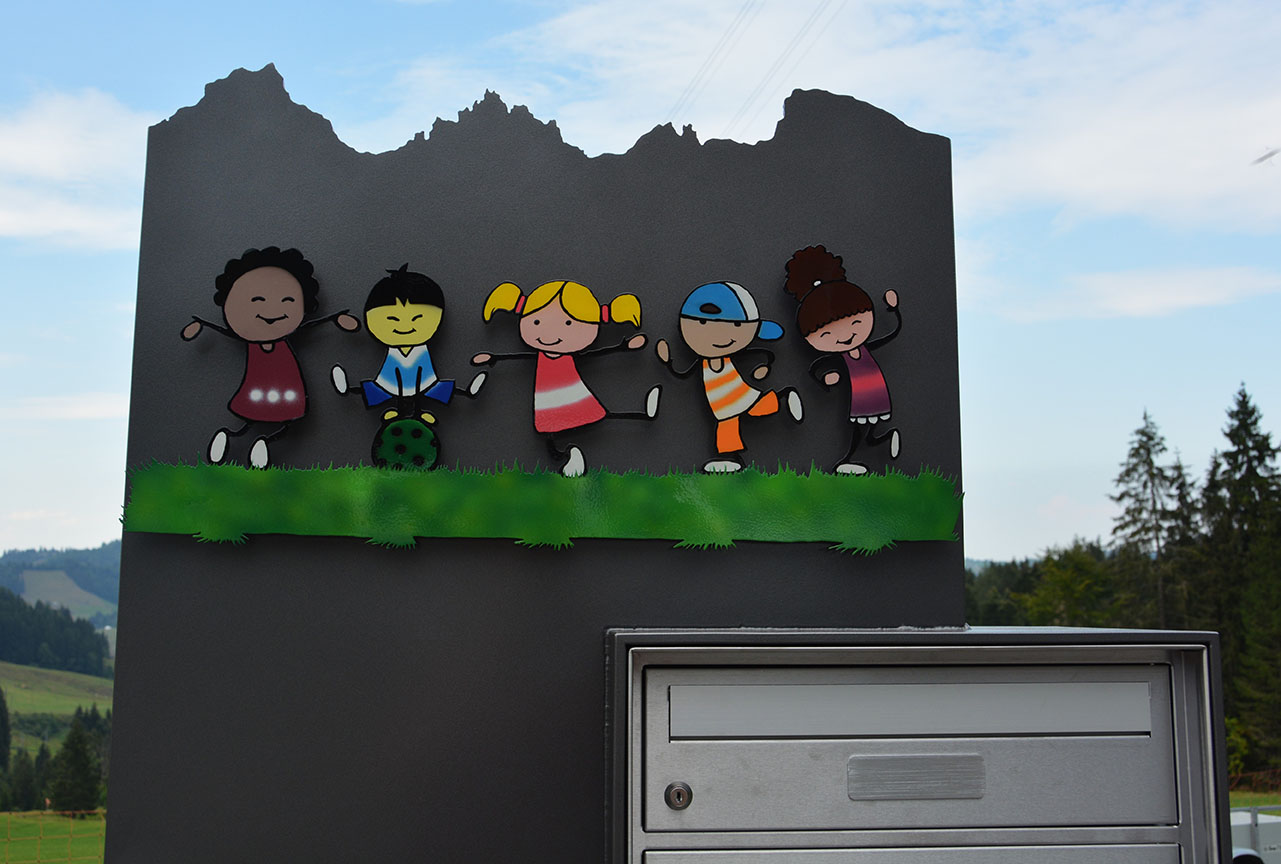 Briefkasten Spezial aus 8mm Stahl mit Bergsicht und Sujet aus Edelstahl lackiert, mit integriertem Briefkasten. Strassenname seitlicht ausgebrannt.