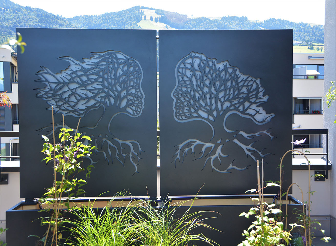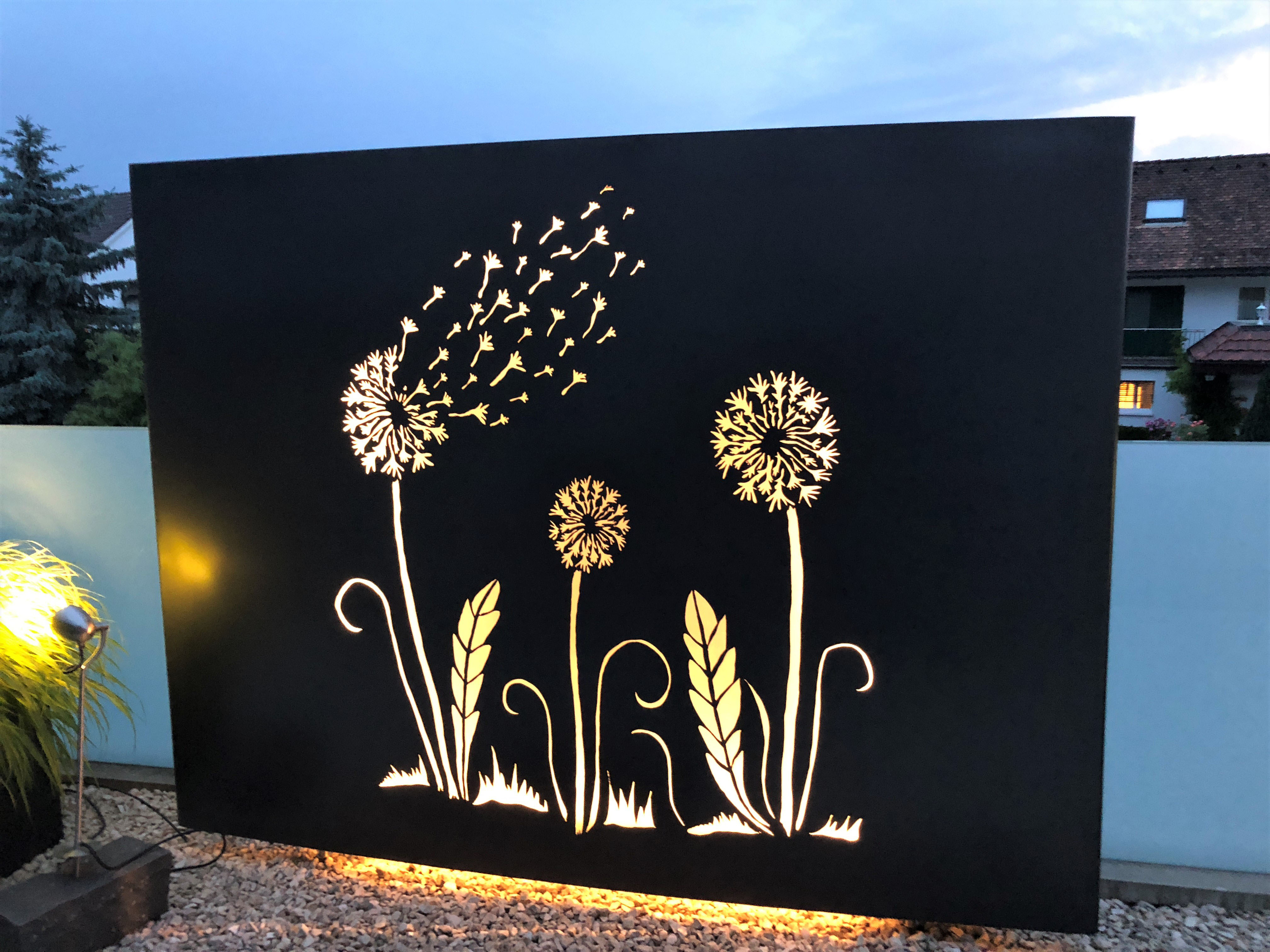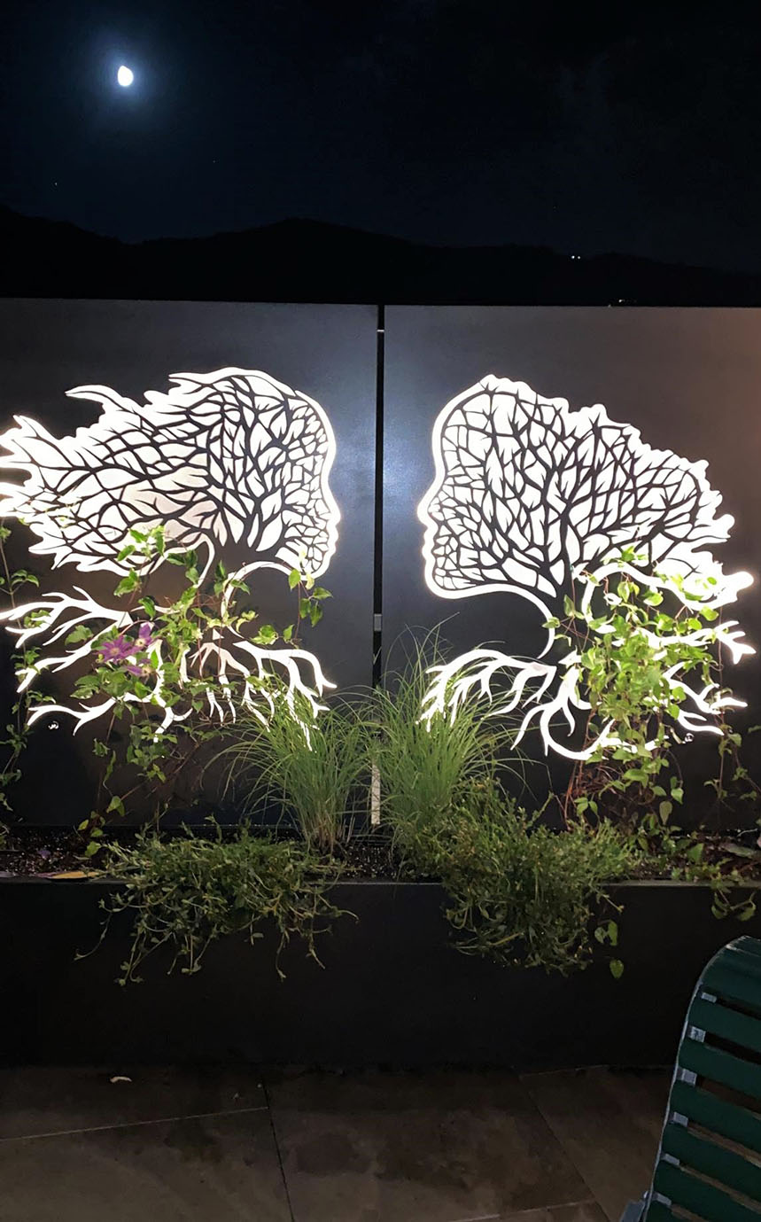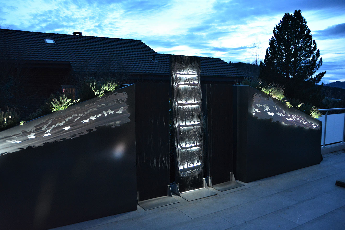 Doppelwandige Sichtschutzwand mit Edelstahl-Sujets, mit LED beleuchtet