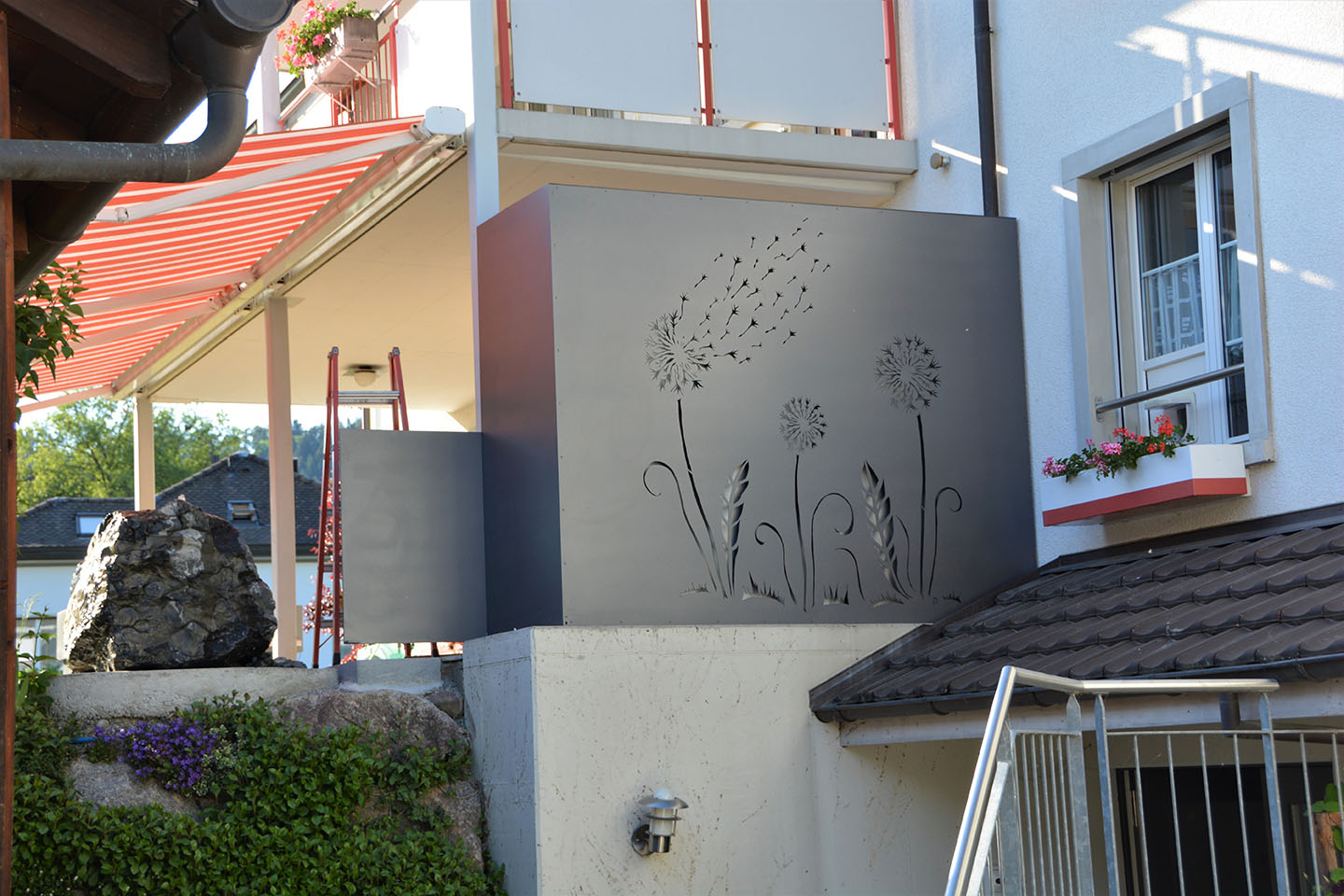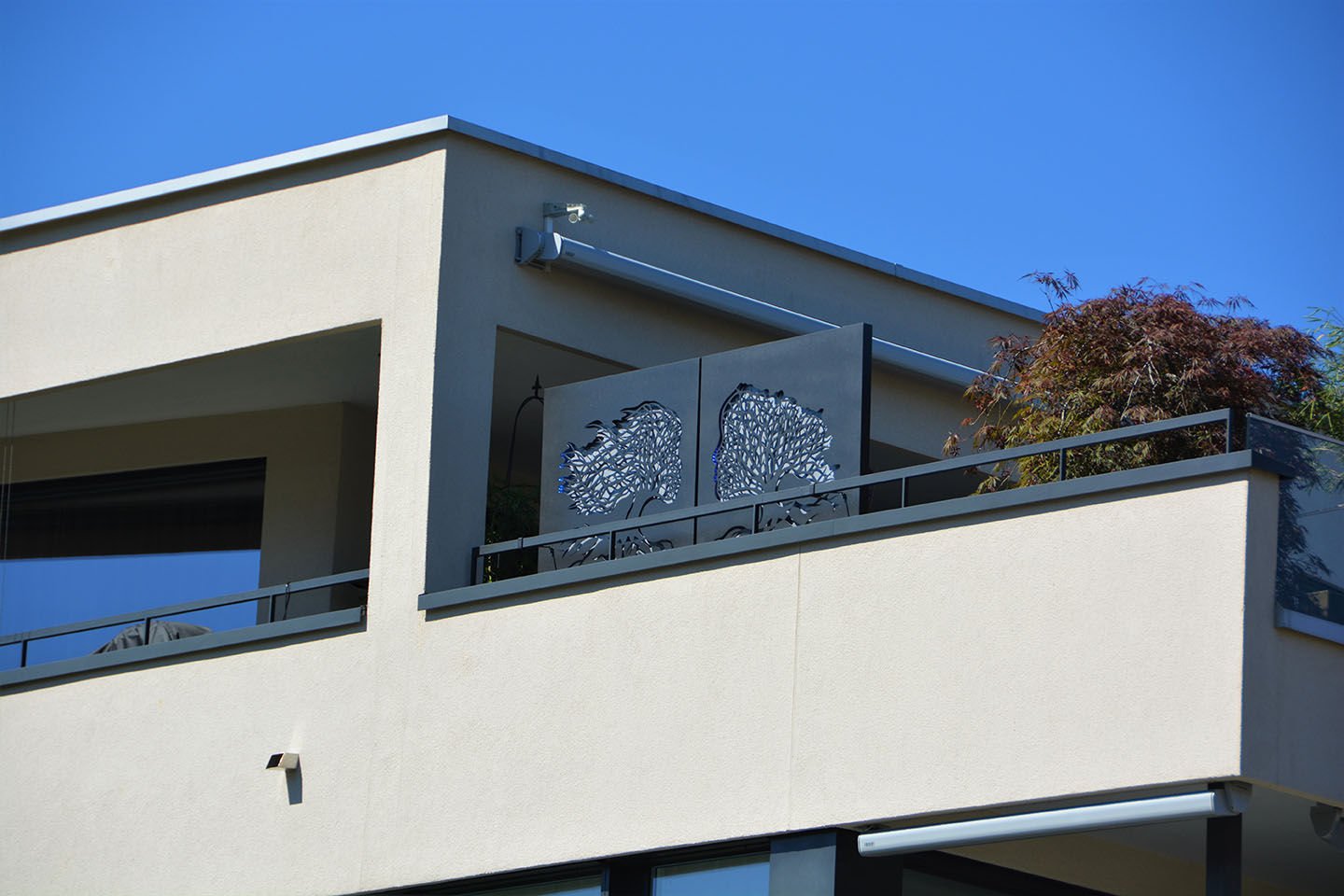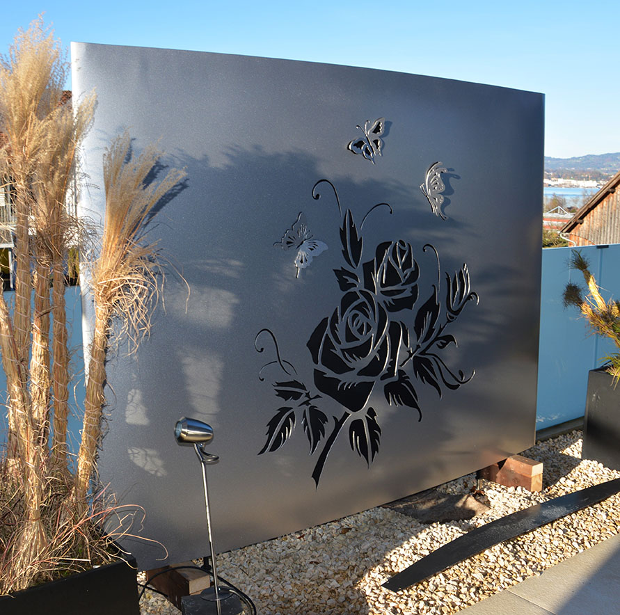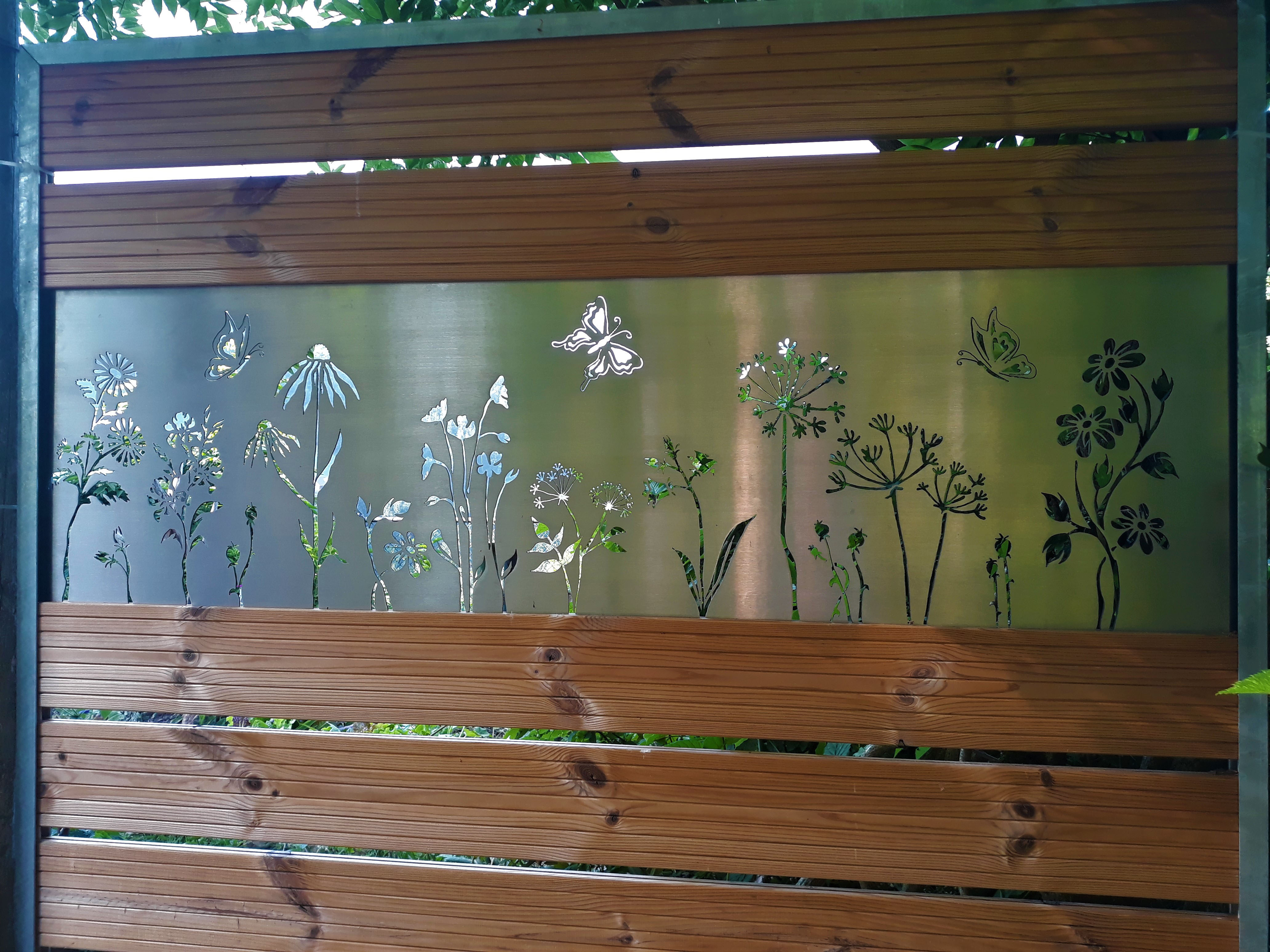 Doppelwandige Sichtschutzwand mit Edelstahl-Sujets, mit LED beleuchtet