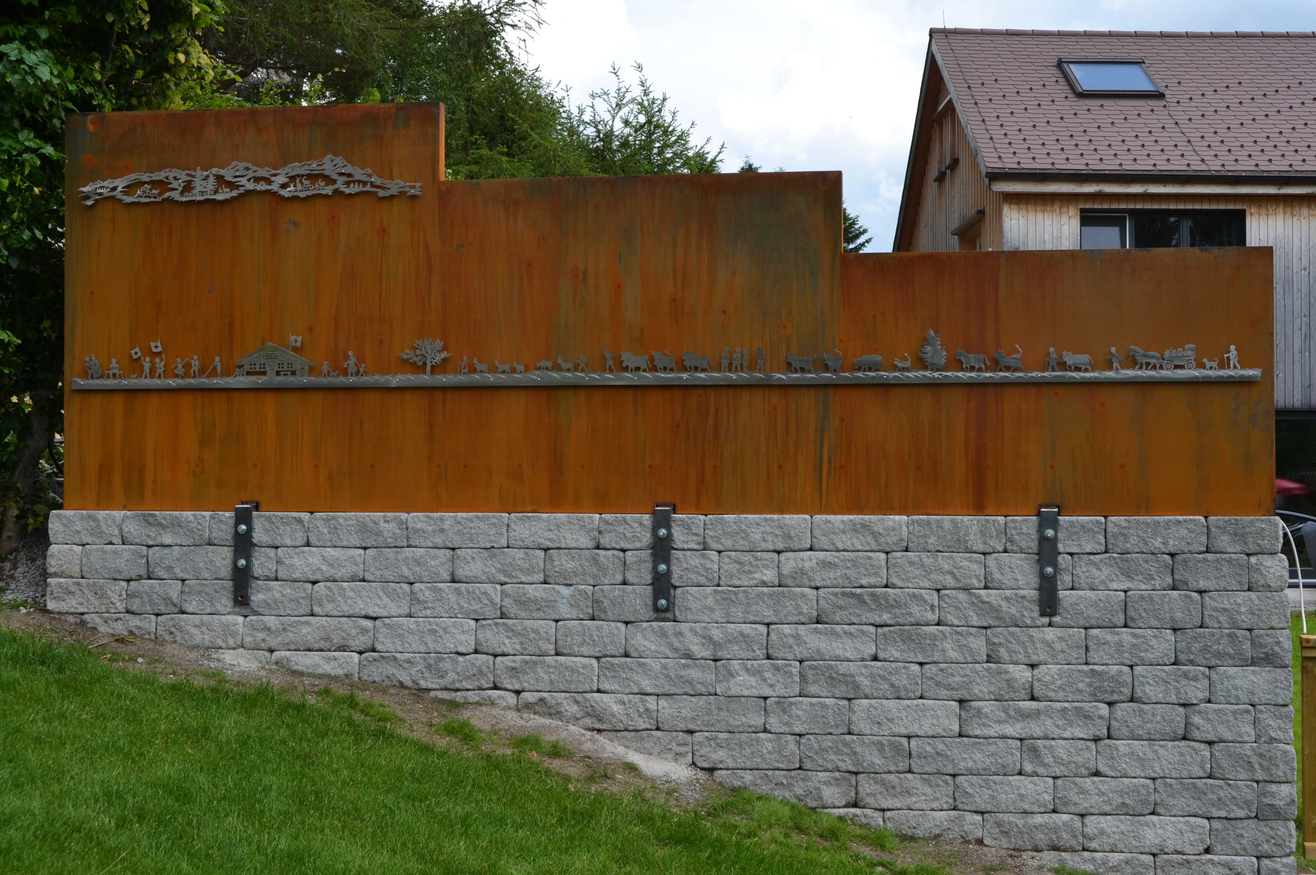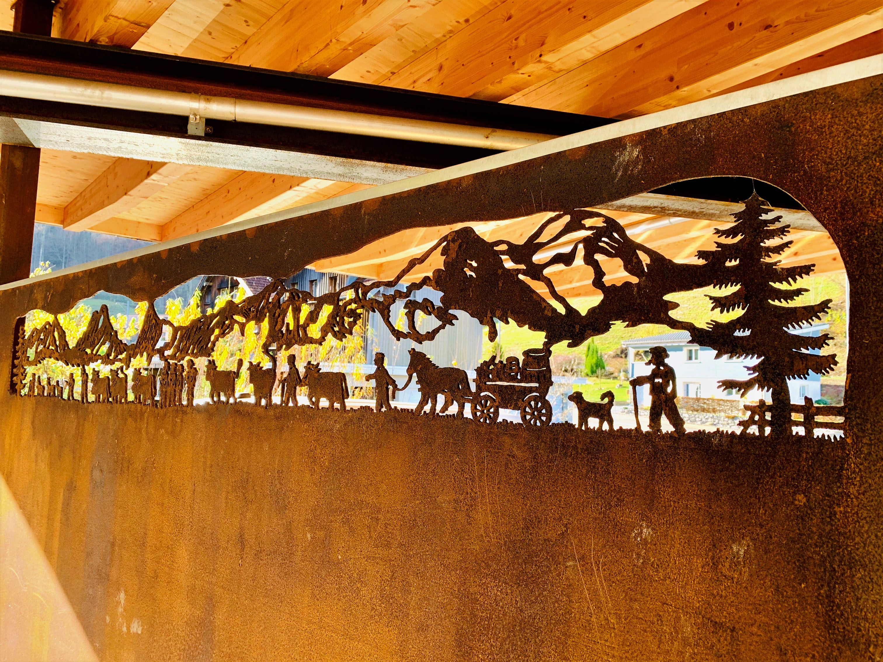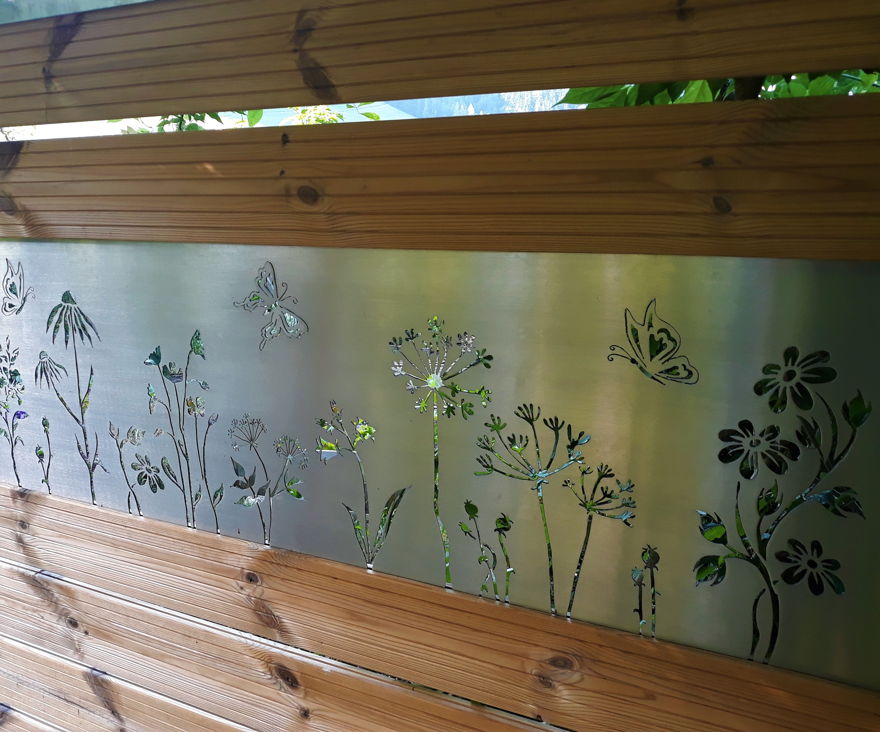 Sichtschutzwand aus 12mm Stahl mit Sitzbänken aus Edelstahl. Sujet: Schwalbenschwarm