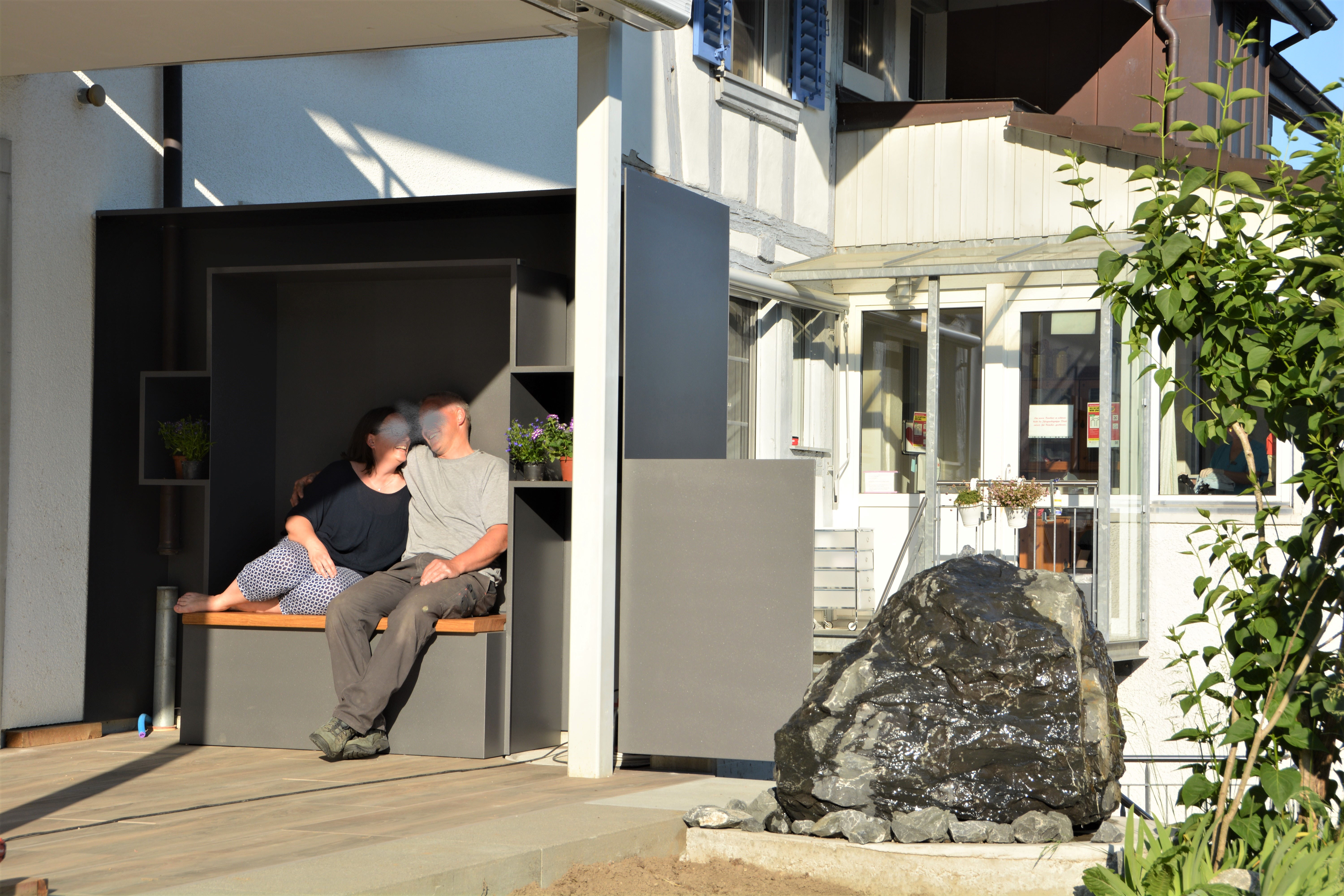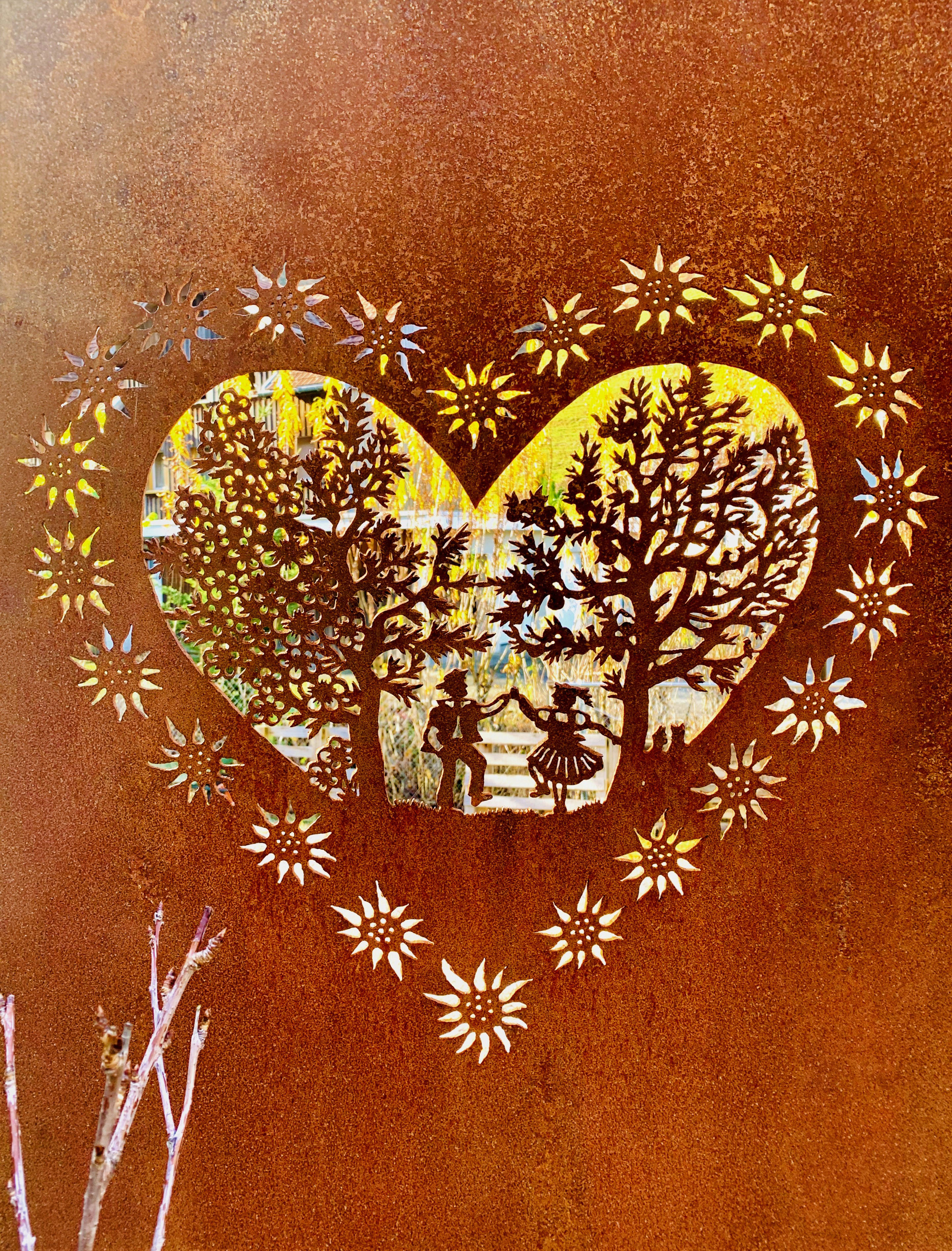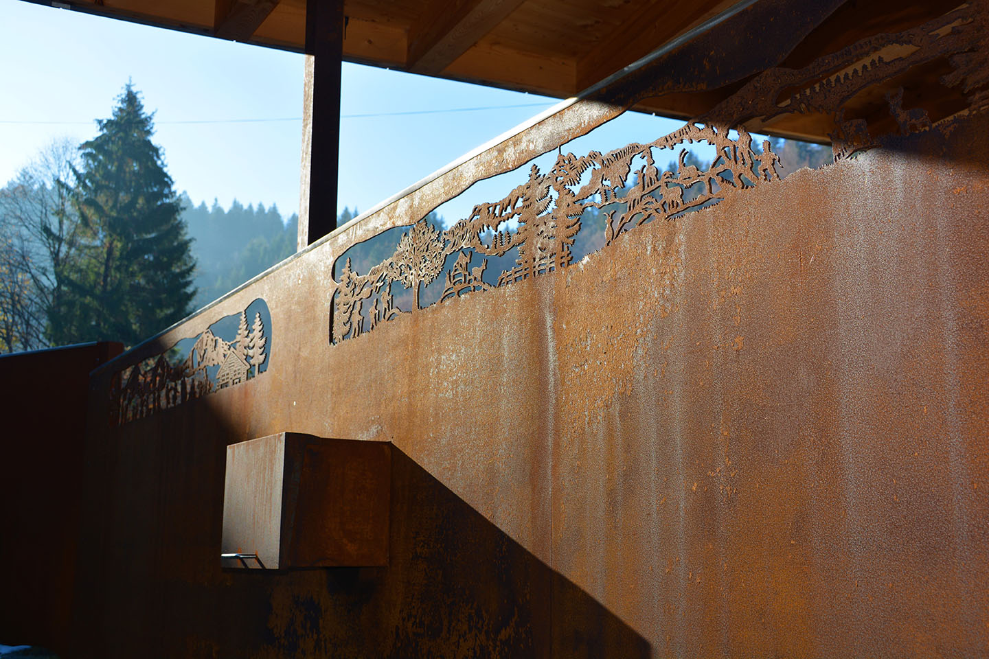 Sichtschutzwand aus 12mm Stahl mit Sitzbänken aus Edelstahl. Sujet: Schwalbenschwarm