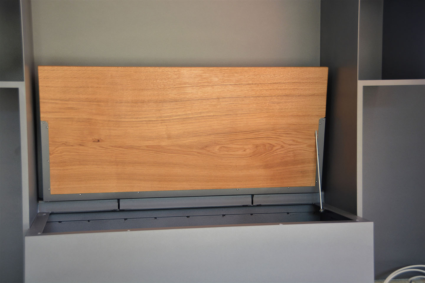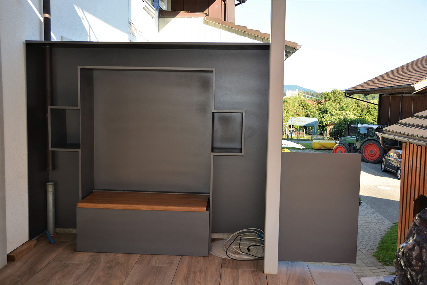 Holzsichtschutzwand: Eisenrahmen lackiert mit Dekofenster und LED-Beleuchtung