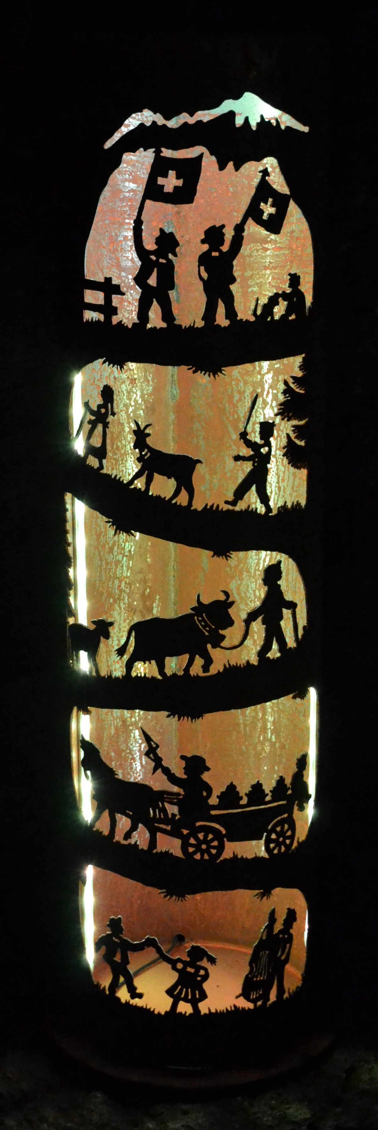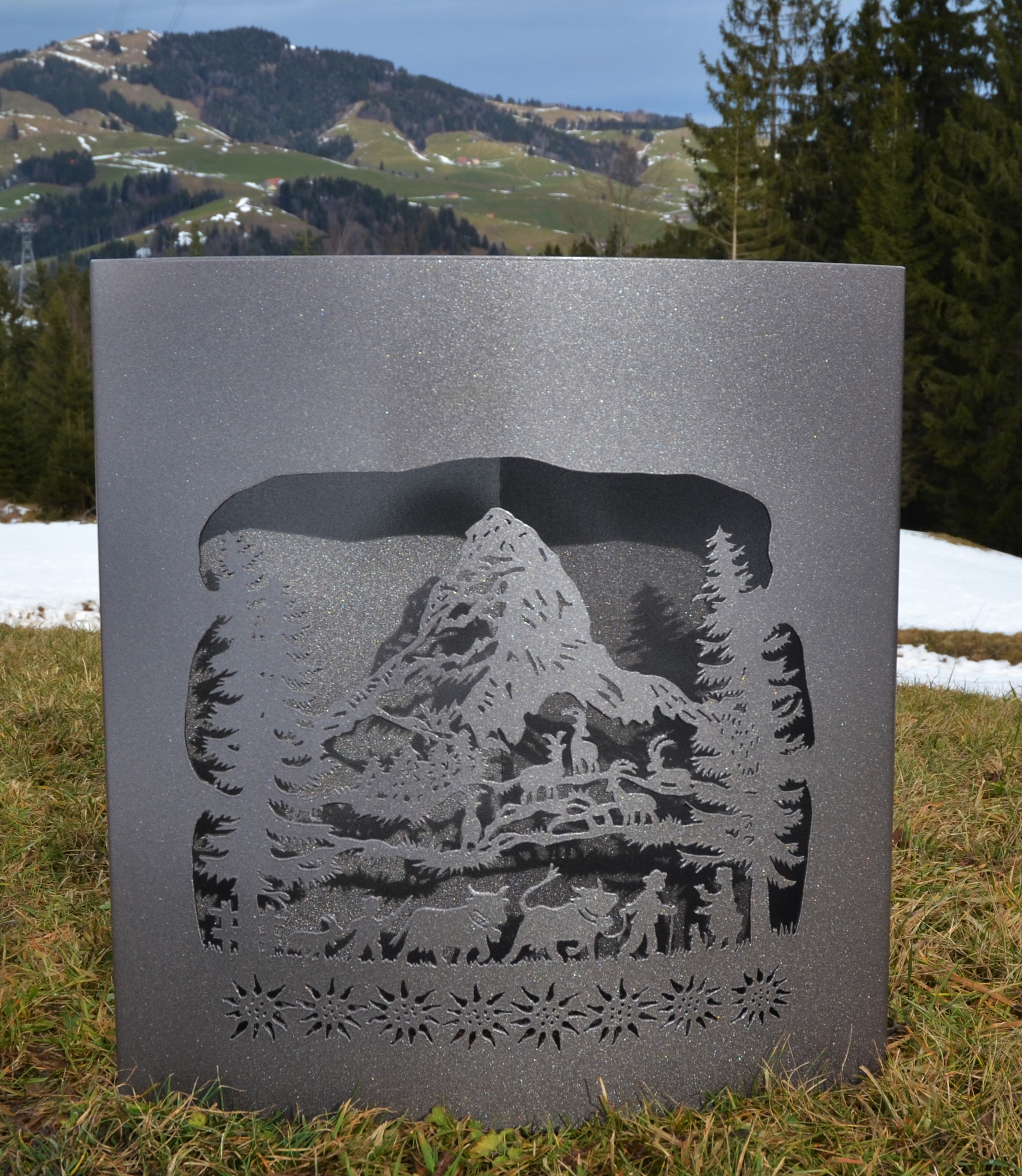 Eisensäule mit Bergen, Alpaufzug und Blumen